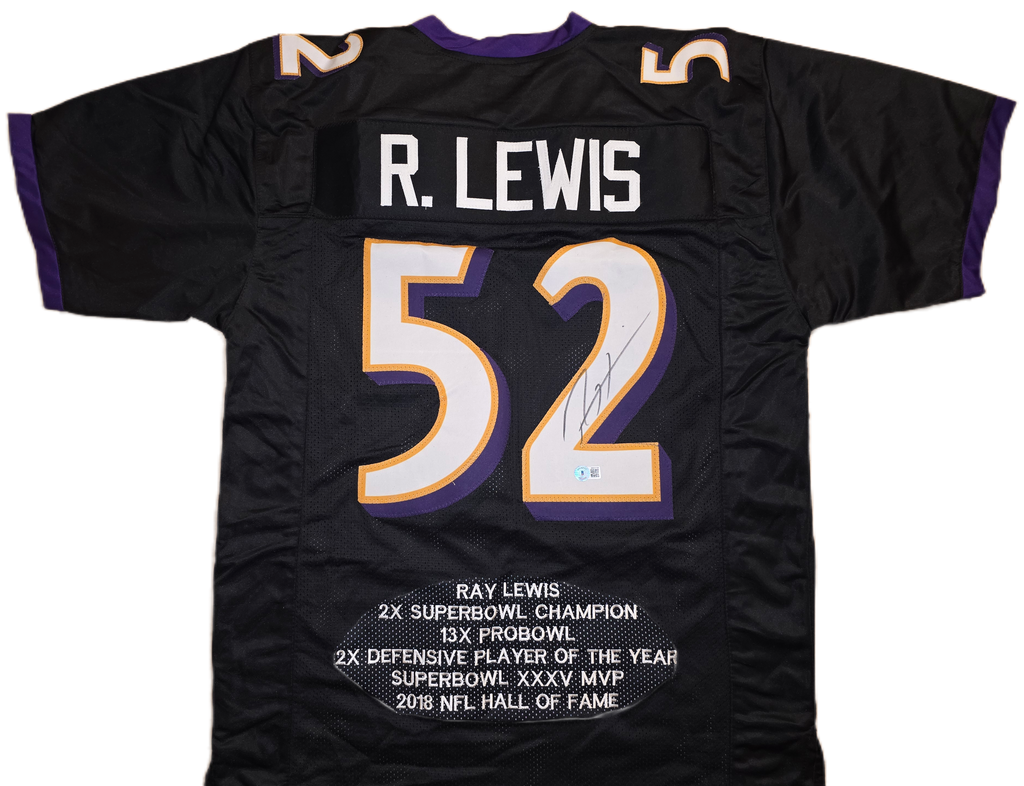 Ray Lewis Autographed Custom Stat Jersey witnessed by Beckett Authentication Services. (BAS)